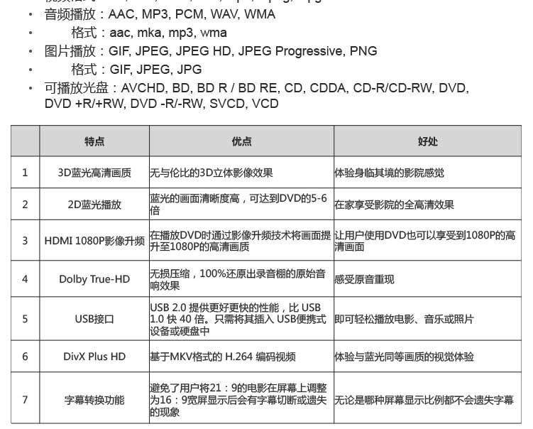 | 参数 | USB/CD/VCD/DVD 270*41*199mm 110-240V/50/60HZ |