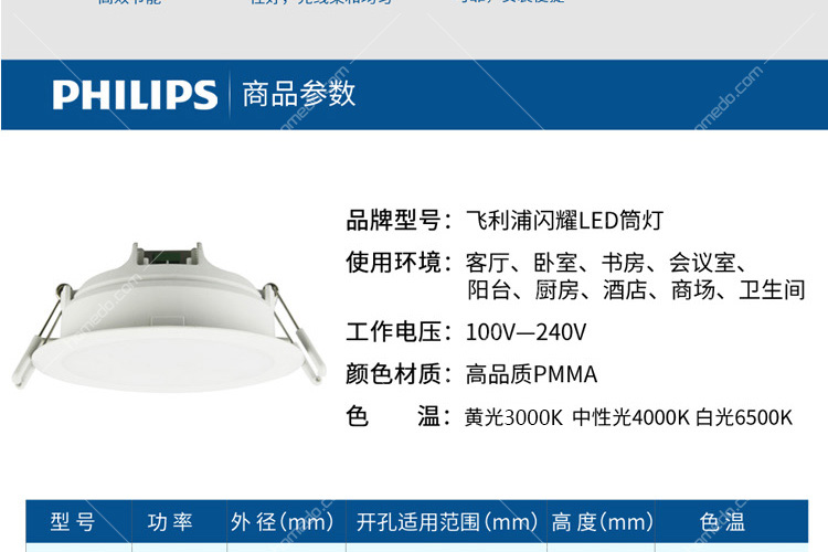 飞利浦 (PHILIPS) 闪耀led筒灯2.5寸开孔80mm 3.5W 白光 6500K