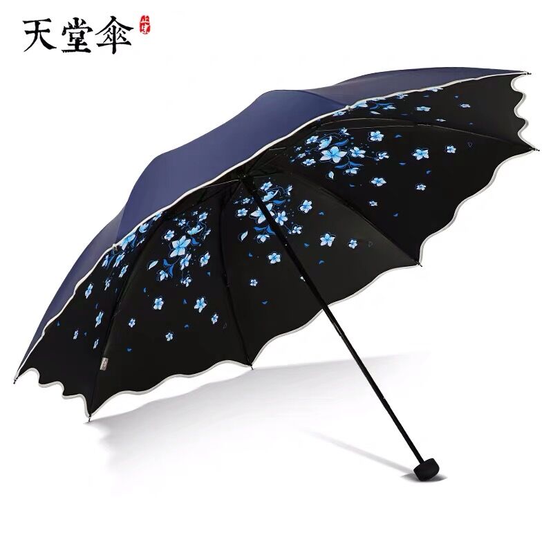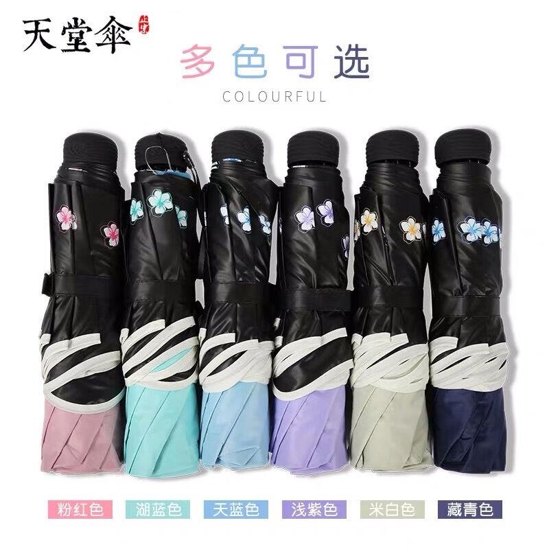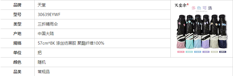 天堂 30639EYWF 57cm*8K 涤丝纺黑胶 聚酯纤维100% 三折晴雨伞 随机
