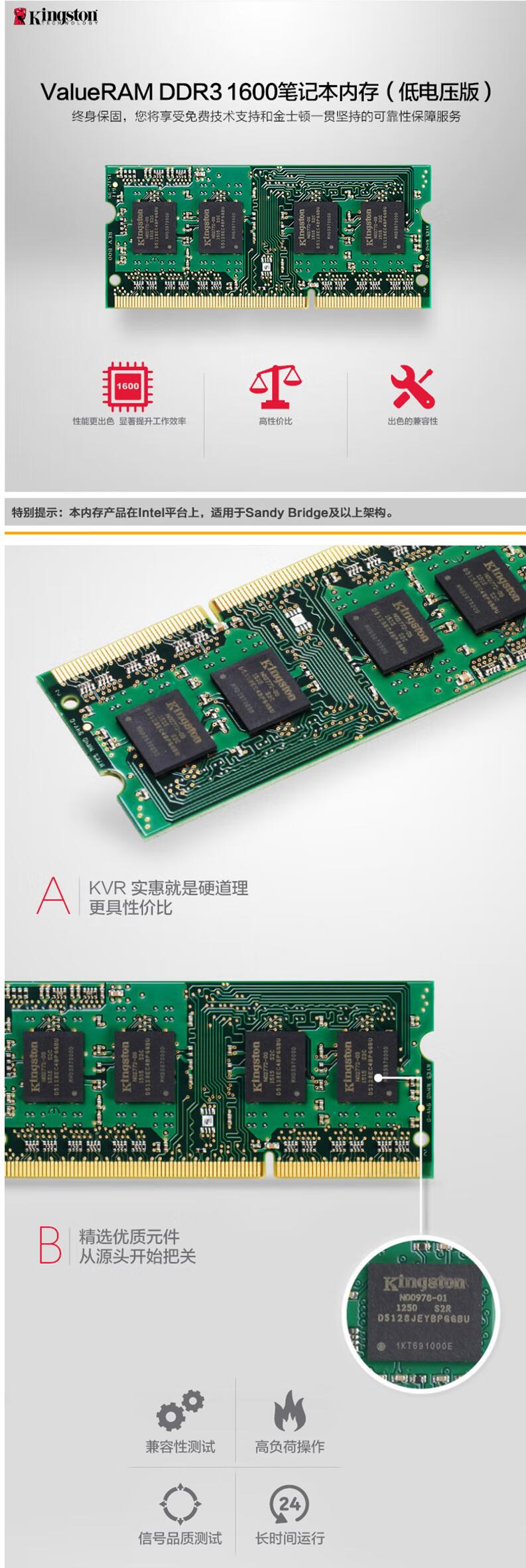 金士顿 8G DDR3—1600 1.3V 内存条 销售单位/个