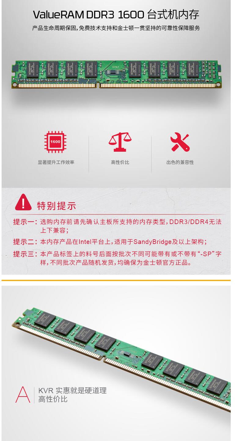 金士顿 (Kingston) 8GB DDR3 1600 台式机内存条销售单位-条