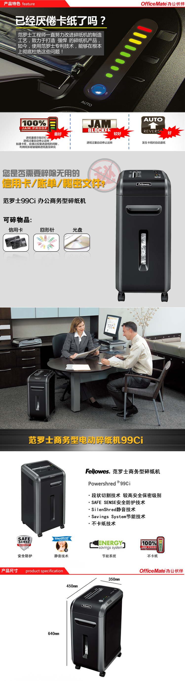 尺寸(长*宽*高):350*450*640mm.重量17.3kg;碎纸效果:(3.9mm*38mm);纸桶容量:34L;可碎纸张/回形针/订书针;最大碎纸能力:A4/70g/17张/入纸口宽225mm;单入口单纸桶