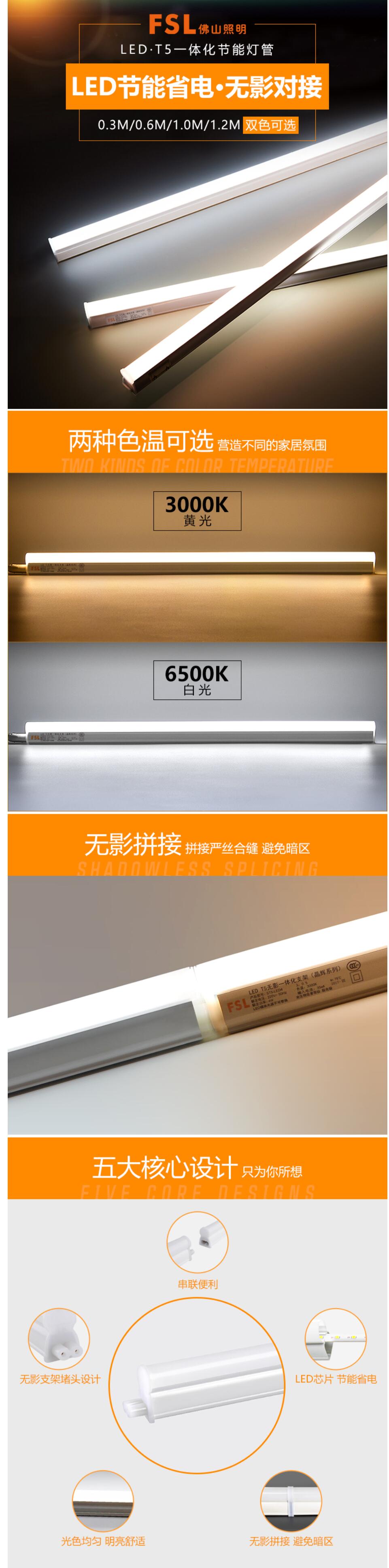 佛山照明LED灯管T5无影一体支架套装0.6米8W白光6500K 两插口 销售单位:套
