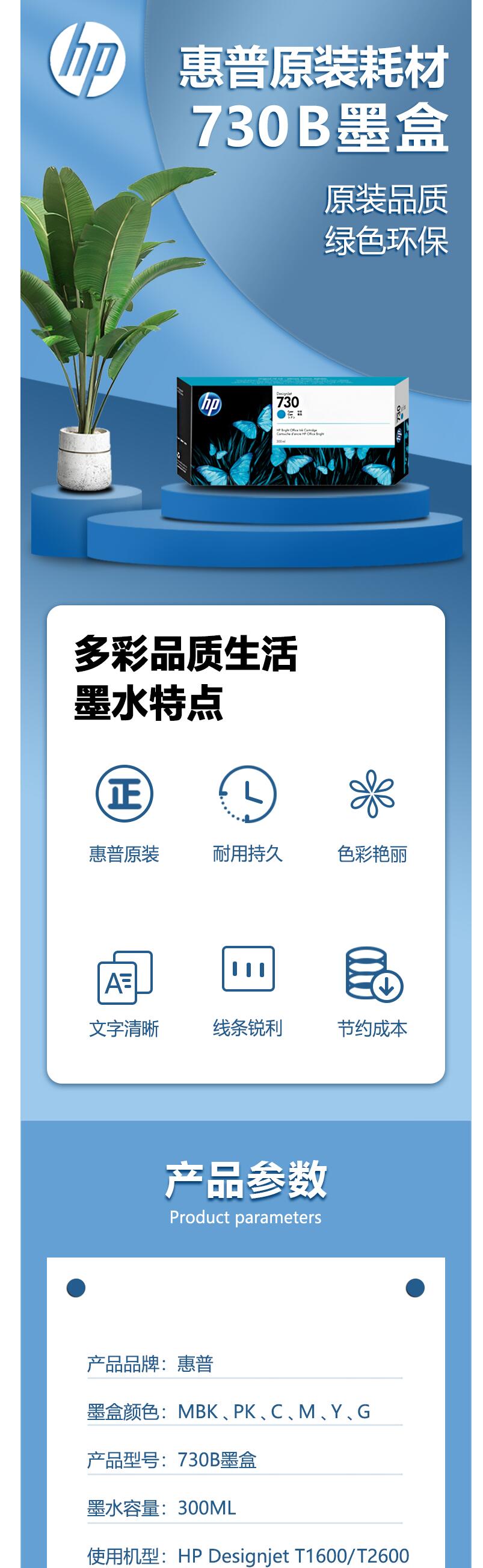 商品名称 :惠普730B墨盒 品牌:惠普 型号:hp 730B 具体产品:惠普墨盒 销售单位:套(一套6色)